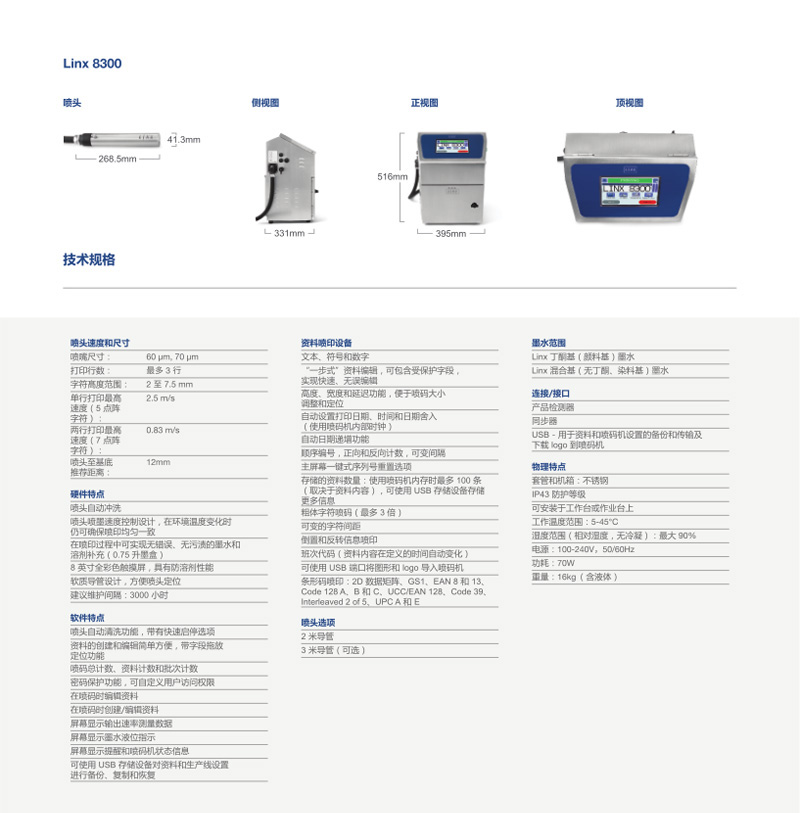 使用快捷,一鍵式更新資料 快干墨水在產(chǎn)品上實(shí)現(xiàn)清晰、準(zhǔn)確的噴碼 整體全金屬外殼,8英寸觸摸屏設(shè)計(jì),簡(jiǎn)單操作 多支持3行噴印,25點(diǎn)陣 配備噴頭自動(dòng)清潔功能由您掌控 噴頭自帶加熱器,應(yīng)對(duì)極端環(huán)境 每分鐘噴碼多達(dá)420件產(chǎn)品,且清晰易讀