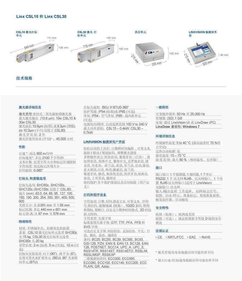 劃線激光系統(tǒng) Linx CSL30 激光打碼機為您提供簡單和復雜編碼的靈活的解決方案,滿足不同行速和材料的需求,為您的個性化需求而設計。Linx 用于超過 20 年的激光打碼生產經驗,,成千上萬個Linx 激光產品在全球范圍內安裝,Linx CSL30 激光打碼機可使用超過26 種語言。